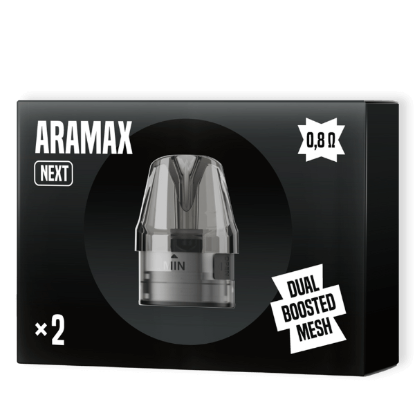 V balení nájdete 2ks plniteľnej cartridge s odporom 0,8ohm vybavenou technológiou dual boosted mesh pre ešte intenzívnejšiu chuť. Určené pre e-cigaretu ARAMAX NEXT.